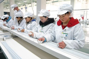 “北川—山东产业园”内,一家电子公司的工人正在流水线上安装LED节能灯灯珠插件。该公司今年1月正式投产,年产LED节能灯750万只,产值4.5亿元。自2010年以来,该园区加强对入驻34家企业新招本土工人的技术培训,目前已解决当地就业岗位3000余个。 成和平/摄