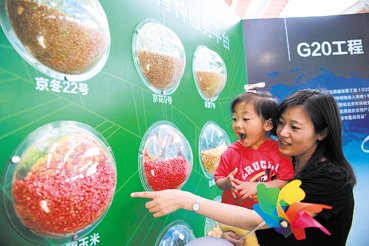 5月14日,北京科技周期间,一位家长在首都现代农业育种服务平台前给孩子讲解小麦、玉米的种子。在著名蔬菜基地山东寿光,“洋种子”已占半壁江山。 陈晓根/摄
