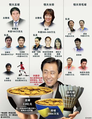 仅仅两年多的时间,广州恒大便建立了一个庞大的体育帝国。去年,恒大在羽毛球项目上投入600万,不仅引进了杜婧、卢兰等强力内援,李宗伟、陶菲克、古健杰、陈文宏等大名鼎鼎的世界名将,也分别被恒大以高价位收入麾下。