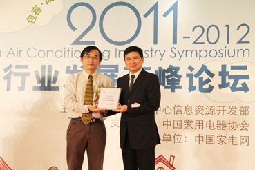 国家信息中心信息资源开发部主任助理蔡莹(左一)向美的颁发“2011冷冻年度空调行业变频空调销量冠军”证书