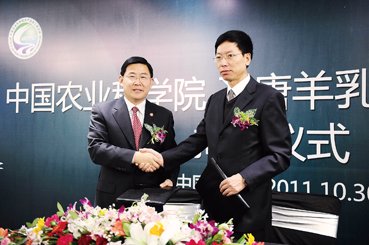 中国农科院农产品加工研究所所长戴小枫(左)与圣唐乳业有限公司董事长武壮田签字后握手