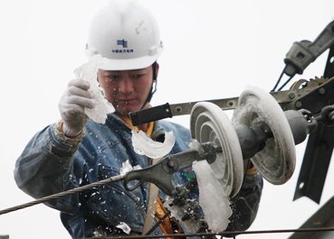 近年来,中央企业在社会责任方面发挥了引领性与标杆性作用。64家央企因优秀的社会责任践行受到肯定。图为南方电网的工人在冒雪作业CNS供图