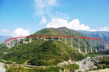 尤其是目前正在施工的四川雅泸高速公路干海子特大桥,是交通运输部重点科研工程,是亚洲第一次建设这样的桥梁,在同类型桥梁中多项指标居世界第一,受到国内外建桥专家关注。该桥为钢管混凝土桁架连续梁桥,处在三国时诸葛亮七擒孟获的艰困之地。全桥三联36跨,位于最小曲线半径356米的S形曲线上,全长1811米,最长一联1044.7米;桥墩采用新型结构钢管混凝土格构墩,最高墩高达107米;第一次采用钢纤维混凝土桥面。二十三局集团在施工中创造性地采用了“三联式施工法”、“拖拉推顶法”相结合的架梁技术。在雅安与凉山交界的托乌山的崇山峻岭中,山间云雾缭绕,横向S形的干海子大桥像一条红色的飘带系在半山腰上。很多干了一辈子桥梁的专家都被该桥的造型新颖和施工的难度所吸引。