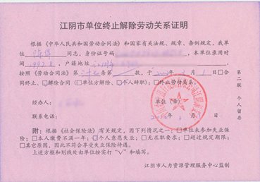 陈华发表在论坛上的《江阴市单位终止解除劳动关系证明》个人留存单。