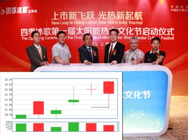 说这话的正是中国太阳能光热第一股日出东方(603366)董事副总经理、四季沐歌太阳能执行总裁李骏。就在控股股东日出东方登陆上交所主板市场的前一天,李骏所领导的四季沐歌太阳能借势发力,在全国启动“第一届四季沐歌太阳能热水文化节”,意在通过行业公益宣传、产品技术展示、镇村活动推广等各种手段,让社会大众开始重新认识太阳能光热行业,让这一产业在国家“节能减排”政策利好驱动下步入升级转型的通道期,一举奠定四季沐歌作为中国太阳能光热产业新时代开拓者和领导者的地位。