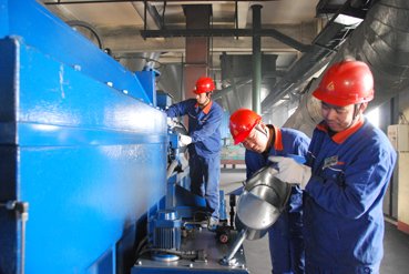 华泽铝电公司员工对成型混捏机进行维护李海英/摄