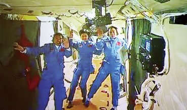 6月18日,北京飞控中心宣布神舟九号与天宫一号组合体建立正常飞行姿态。经历了40多个小时的太空生活,神舟九号航天员景海鹏、刘旺、刘洋迎来了相拥天宫的一刻。图为在北京指挥中心屏幕上拍摄,三位航天员在舱内的“全家福”。CNS供图