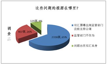 从调查题目看,2318位网民认为:“监管部门没能为消费者主持公道,以至于问题不断。”持这一看法的网民占比65%;907位网民认为:“问题出在监管部门不作为”,占比26%;仅有329位网民认为:“问题出在双汇本身,占比9%。”