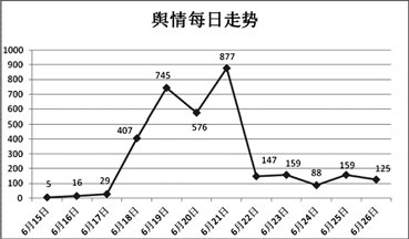 6月15日,《法制日报》首发报道了黑龙江省颁布《黑龙江省气候资源探测与保护条例》一事,从曲线走势中可以看出,舆情经过了三天的常规发酵后,于6月18日产生爆发性蔓延,由此前几天的小范围报道突增至407条,次日再次增长300余条,达到了745条。