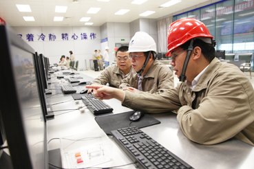 王汉武(左三)在控制室向领导汇报机组运行参数情况