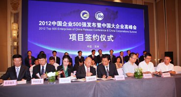 9月1日,2012中国企业500强发布暨中国大企业高峰会项目签约仪式在长春举行。仪式上,国内500强企业与吉林省在重点产业、基础设施、科技创新等领域集中签约38个重点合作项目,投资总额达1274亿元。