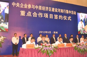 9月24日,“2012年中央企业参与中原经济区建设河南行集中活动”重点项目签约仪式在郑州举行。国务院国资委副秘书长阎晓峰,32家中央企业负责人,河南省副省长陈雪枫出席签约仪式,国务院国资委规划发展局、各省辖市及省管企业的负责人近550人参加签约仪式。