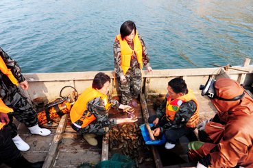 大连市人大代表岳喜芳(左一)在海上查看海产品生产情况