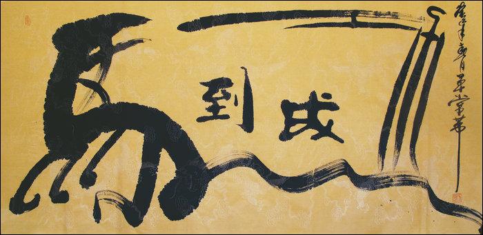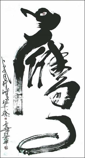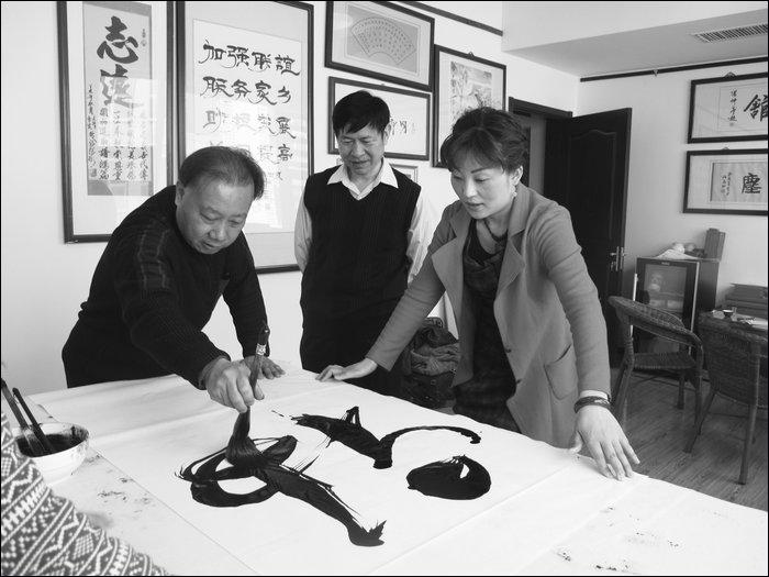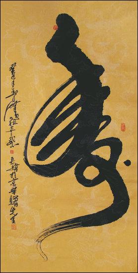 初见刘长玮本人,会给人一种傲慢、深沉且又透着豪爽的印象。了解他之后便知他本人与他的外在着装形象大有相同之处,随意中带着张力。刘长玮写作时总不会忘记换上那绣着“龙”图案的外套,并且喜欢热闹、人多,特别是在给他做采访的时候,有摄像的、拍照的,还有一些为一睹大家创作风采的人在场的时候,也就是他的书法艺术发挥到淋漓尽致之时,他的创作兴致也随之达到了高潮。这就是刘长玮“怪”之一吧。他的隶书以拙取巧,草书尤以“一笔龙”著称,跃然纸上,活灵活现,令人百看不厌。并且练就了“双手能倒写梅花篆字”的硬功夫。刘长玮习字临摹,多随兴致而为,较为随意。无论碑帖都经常是朝三暮四地更换着临习,有时经常是心与眼间的默临。也许这就是怪杰之怪。