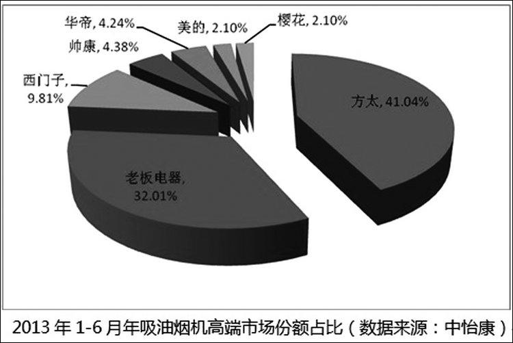 中怡康数据显示:2013年1月—6月,方太高端市场份额占比就达到了41.04%,几乎占到市场“半壁江山”。不只是在高端油烟机产品上,在高端燃气灶、高端消毒柜等产品上,方太等本土企业也同样牢牢把握着领跑地位,稳居市场前列。