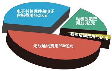 据杜恩龙测算,电子书包硬件和电子白板费用合计为3911亿元,按照最短寿命6年计算,平均每年产生大约652亿元的费用。此外,电源改造费用、教师培训费用、无线通讯费用(九年制义务教育阶段)保守估计分别为320亿元、53亿元、930亿元。