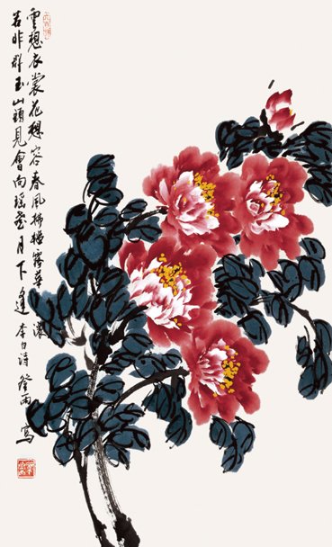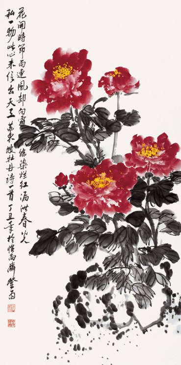 在国画方面,马登雨同样造诣深厚,其作品可谓国色天香,芬芳馥郁,沁人心脾。其所画的牡丹,姚黄魏紫,天真烂漫,可分为墨、风、晴、露、夜数款。1995年魏启后看过他的画作后,欣然题词鼓励,并嘱其多写多画,持之以恒,必将受益终生。山东省委老书记苏毅然题写“江山盛世春风里,日月新天画图中”以示励勉;所作梅、兰、竹、菊,玉兰、荷花、水仙、禽鸟、草虫之类,均取自造化,师法传统,骨法用笔,自然生动;既深得海派吴昌硕大师神韵,又有齐白石、王雪涛等众多名家的画风影响;所作山水,属高古简约一路,立足文人,力追倪黄。