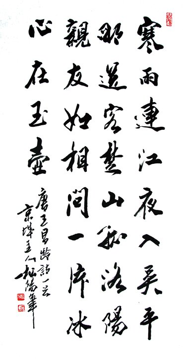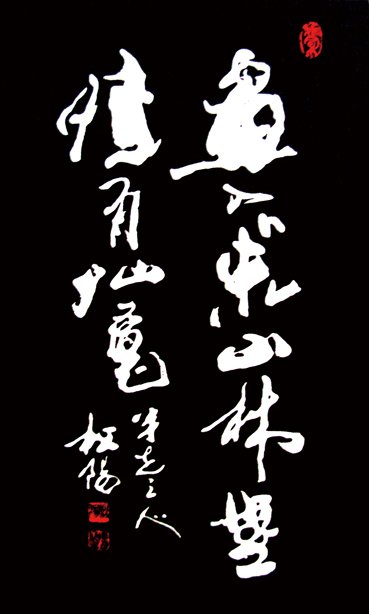 松阳大师自幼酷爱书画,刻苦自学。几十年痴情于翰墨,上至二王、颜柳;下逮金农、郑板桥,潜心研求书画之真谛。他曾拜我国著名书法家萧劳为师,并游历名山大川,踪迹遍于五岳,得天地之灵气,从而形成了运笔流畅、气势磅礴的艺术风格。小楷工整俊逸、行书遒劲隽秀。力道含内,苍劲寓外。尤善左右开弓,双管挥毫。其狂草江河奔涌气势夺人,出神入化,堪称一绝,有“东方书坛狂人”之称,有“松阳巨笔世界之最”之称。