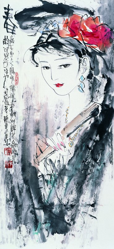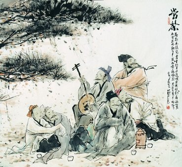 至于说到绘画奇才,籍忠亮是当之无愧的。他如今在艺术创作上驾轻就熟地驰骋自己的才能,全靠长期坚持不懈的刻苦磨练,钻研传统国画技艺,深究中西绘画创作原理,既注重造型功力,更不放松笔墨语言的提炼。他深谙传统文人画笔墨之精妙和表达情趣之真切,在文人画的体系中做创新的努力;同时,他也认识到文人画语言与表现现代人和事之间的距离,要通过巧妙地运用西画的结构造型加以补充,以达到完善的境地。籍忠亮的绘画技巧全面,他在古今人物画上均有出色的创造。他塑造的各种古代文人和仕女形象,运用文人画一波三折的线条和笔墨的点擦皴染,在人物造型的“雅”和“神韵”上下功夫,传达出他自由潇洒的内心世界。他似乎坦诚地与描写对象作感情的交流,彼此交融于画面的形象中,自己进入“无我”的境界。不用说,在这类作品中作者需要运用自己古典文化知识的储备、理论的学养和传统文人的情怀,以发挥自己的想象力,创造亦真亦幻的境象。而描写现实的人物画,他需要调动另一些手段,在真实形象的塑造上展示自己的才能。值得注意的是,除了借助于素描和速写的功力以形写神、塑造形神兼备的人物外,籍忠亮探索出自己一套独特的方法,将块面造型和传统笔墨有机地结合起来,在画面的虚实上、在主体人物与背景虚幻空间的关系上、在墨与色的相互辉映的处理上做文章,时而在写真的描写中展示自己的才华,时而在写意中别出一格。