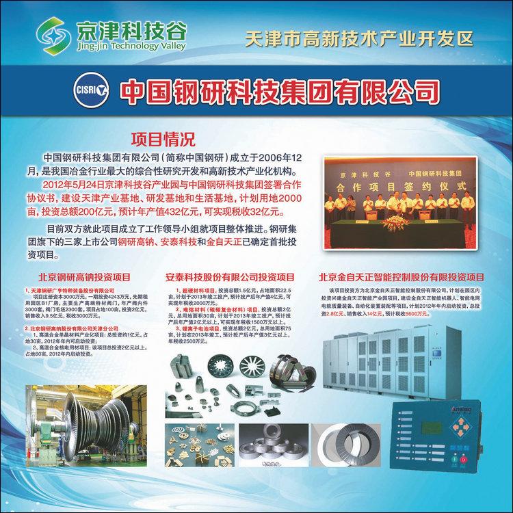 基本情况:该项目坐落于京津科技谷产业园区西区福远路西侧,由中国钢研集团投资建设。规划总占地2000亩,一期建筑面积213334.40平方米,计划总投资200亿元。将建设成为以新材料、自动控制技术等为主,及“产、学、研”为一体的产业地等。项目全部建成后,预计可实现年销售收入432亿元,税收32亿元,可吸纳就业3万人。