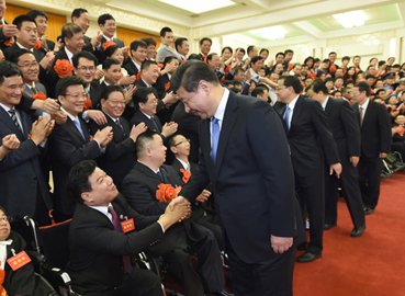 5月16日,党和国家领导人习近平、李克强、刘云山、张高丽等在北京人民大会堂会见第五次全国自强模范暨助残先进集体和个人表彰大会受表彰代表。 新华社记者 马占成/摄