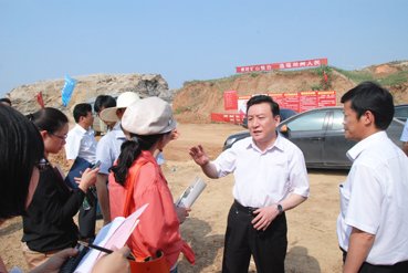 徐州市国土局党组成员、邳州市国土局局长邵晓旭(右二)在工矿废弃地复垦现场接受媒体采访