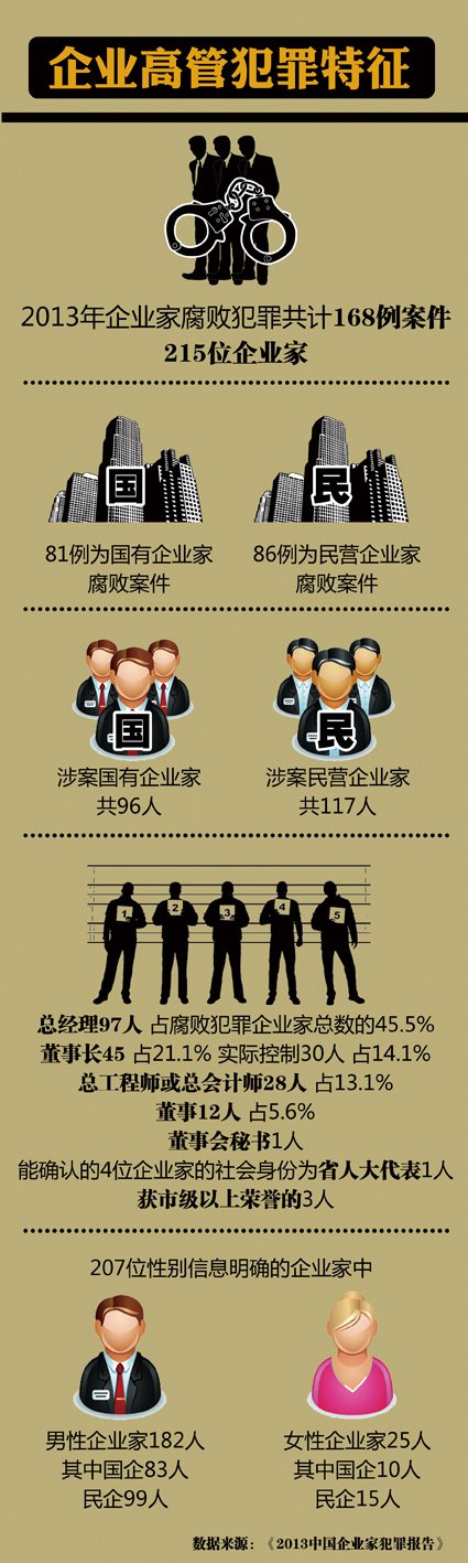 法制日报社发布《2013中国企业家犯罪报告》披露,截至2013年12月31日,共搜集到企业家犯罪案件463例,涉案企业家共计599位。其中国企涉案110例,涉案企业家128人。统计中涉案企业家在企业内任职务的592人中,总经理有224人,占37.8%。可核实身份的涉案企业家中,有28人身份较高。