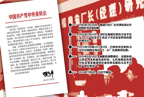 “30年前,福建55位企业负责人大胆发出给企业‘松绑’放权的呼吁,很快在全国上下形成共识,成就了经济体制改革的一段佳话,我对此印象犹深……希望你们和广大企业家一道,深刻领会、深入贯彻党的十八届三中全会精神,继续发扬‘敢为天下先、爱拼才会赢’的闯劲。”