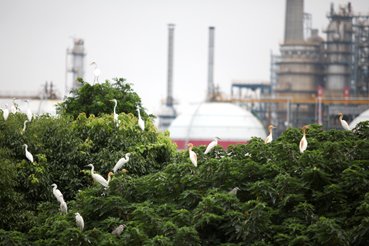镇海炼化这片小树林被员工称为“百鹭园”。因为“百鹭园”里鹭鸟数量众多,多达数百只,而且除了常见的白鹭、牛背鹭、池鹭、夜鹭等,还有大白鹭等珍稀品种。这些鹭鸟每年都会按时来这里求偶、交配、筑巢、产卵、孵卵和育雏。这种情况至少有11年了。