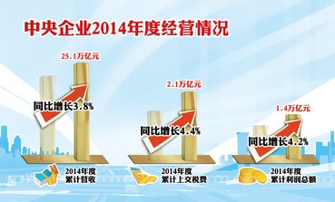 2014年度中央企业累计实现营业收入25.1万亿元,同比增长3.8%;累计上交税费总额2.1万亿元,同比增长4.4%;累计实现利润总额1.4万亿元,同比增长4.2%。