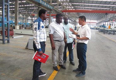 尼日利亚客商参观了石材机械公司生产车间,在窄板生产线、龙门式组合锯等产品前驻足,详细询问产品性能,特别是现场观看了窄板生产线生产加工演示后,对生产线自动上料、卸料智能机械手产生浓厚兴趣,并达成产品意向订单。