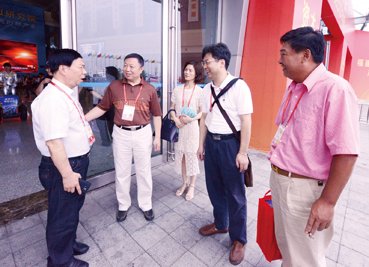 上饶市企业联合会、企业家协会会长肖天连与市全国优秀企业家交谈。