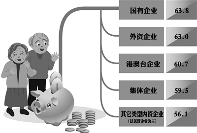 具体到企业类型,职工养老储备指数更是具有明显差异。其中,最高的是国有企业,职工养老储备指数为63.8。
