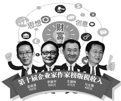 中国企业家不但开始写书、卖书,而且靠着市场的“宠儿”身份挤进“中国作家财富榜”。“卖思想赚钱”的结果是:吴晓波、罗振宇、王健林分别以750万元、600万元、415万元的版税收入占据榜单前三甲。