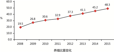 2015年存栏100头以上奶牛的规模养殖比重达48.3%,比2008年提高了28.8个百分点,规模养殖场100%实现机械化挤奶;奶农专业合作社超过1.5万个,是2008年的7倍多;伊利、蒙牛、现代牧业、光明、三元、君乐宝、飞鹤等中国奶业前20强企业乳制品产量、销售额分别占全国的51%和54%,产业集中度进一步提升,现代奶业建设步伐加快,奶牛养殖规模化、标准化、机械化、组织化水平不断提高。