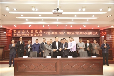 光大证券与西吉县签订《“证券+期货+保险”帮扶合作框架协议》,是光大证券落实国家脱贫攻坚战略、加强区域合作、履行社会责任的有力举措,也标志着宁夏回族自治区联合各大券商以“一司一县”结对帮扶形式在当地开展精准扶贫、有效扶贫的工作又迈进了一步。