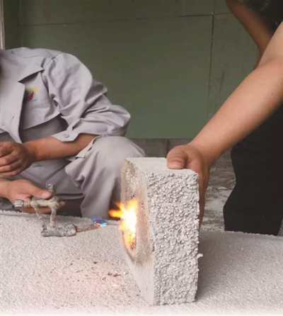 NCC材料为细小封闭泡孔结构构成,既具有优异的保温隔热隔音性能,又有良好的耐水性和抗冻融性,同时又具备一定的透气性,使保温系统具有一定的呼吸功能,避免墙体结露,并有效保证了高层住宅的防火安全。在施工现场,为验证该材料的防火性能,记者用打火机点燃已铺设好防火保温材料的屋顶一角,在短暂的几秒后,火苗就自动熄灭了。
