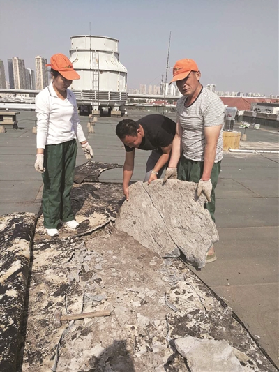修复一个漏水的屋顶并没有普通人想象的那样简单。邹玲介绍,因楼顶原来的防水材料质量不高,且有多处渗漏点,施工需要经过修补、做保温层、挂网格布、做抗裂砂浆、加防水涂料、铺高分子卷材等一系列复杂工序。