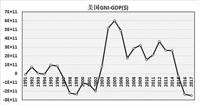 1)1991—2017年美国的GNI与GDP之差变化趋势图(见表1)