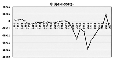 2002—2017年GNI与GDP之差的累计为-3.3997万亿美元。通俗地说,在这16年中,中国从外国赚的钱减去外国从中国赚的钱,还欠缺3.4万亿美元。说明中国在全球化经营环境中开放的力度不弱,但“走出去”的能力不强;从图中可看出此现象最近几年有所好转。