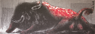 关玉良所绘制的《中国牛》则冲破了传统水墨画冲淡蕴藉、中庸平和的审美趣味,注入了现代精神,是表现性的、意象的,在具体和抽象之间,画风雄浑苍劲、浓烈奇异、神秘怪诞。如果说中国传统的水墨画是意境淡雅的田园诗,那么,关玉良的水墨画则是悲怆苍凉的边塞诗。红牛树立的形象就如同艺术家强大的东方诗意的至高标志。 (李佳丽)