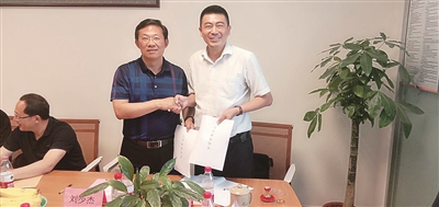 | 牟平区区委常委、副区长刘少杰(左)中科亿顺董事长李东霖 |