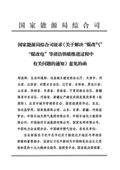 近日,国家能源局发布了征求《关于解决“煤改气”“煤改电”等清洁供暖推进过程中有关问题的通知》的意见函,提出建立和完善清洁取暖协调议事机制,明确牵头部门和任务分工,根据工作需要定期或不定期召开专题会议,研究有关事项,提出措施建议,并加强跟踪督促,推动相关单位密切配合,相互支持,主动作为,形成合力,妥善解决好“煤改气”、“煤改电”等清洁供暖项目推进过程中的各类问题,确保重点项目按期投运。