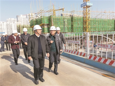 | 水发集团总经理助理葛兆生(前排左一)参观凤城项目建设,水发建安总经理王胜东(前排右一)陪同参观 |