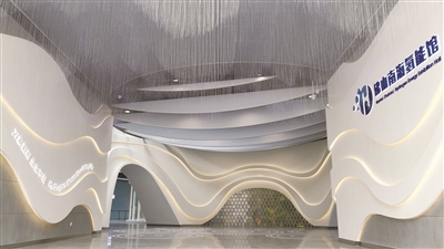 第四厅是企业招商区。本展区是以产业推广、成果展示、招商洽谈为核心功能的独立区域。通过陈列最前沿的研发成果及模型结合VR互动、全息影像、通电玻璃等多媒体互动形式,依次展示制氢及制氢加氢设备研制、加氢站设计与建设、氢燃料电池系统及核心部件、整车制造、氢产品检测与设备研制、产学研创新,即南海氢能产业链的六大核心环节。此区的实体沙盘全方位解读南海区在产业政策上的全产业链服务,展现产业园区、氢能企业以及配套设施的空间布局。