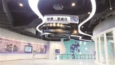第二厅是能源科普区。设置了多款多媒体感应装置展示氢能的特点及应用。比如,有一面光影叠加的主题魔法墙,通过拍打感应点,墙面可动态演绎氢能产业链从上游、中游到下游的各个环节。