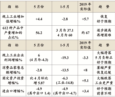 从表中分析可以看出,5月份工业经济正在复苏回暖。规模以上工业增加值恢复好于预期;工业产品中产量增加的品种占比逐步提高,但再增困难;规模以上工业企业利润大幅减少,正逐渐回升,5月当月明显好于预期;消费品零售总额萎缩严重,恢复迟缓;投资大幅跌落,工业更严重,开始有变化;进出口比预测好,但前景不明。上述指标与2019年实际值对比相去较远,恢复正常还需时日。