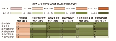 企业对于法治环境的总体评价一般,评分为7分(见表9)。但是大型民营企业和地方国有企业认为法治环境表现较好,评分分别为7.7分和7.5分;中央企业和中小民营企业的评分最低,为6.8分,评价一般。具体而言,企业对于企业自主经营权、合法权益保护、知识产权保护、合同违约纠纷处理以及账款拖欠治理的评价较好,分别为3.8、3.7、3.8、3.6和3.6分。其中,外商投资企业在知识产权保护、处理合同违约纠纷、治理拖欠企业账款方面的评价较差,仅有2.8、2.8与2.3分,表明知识产权保护、合同纠纷处理与账款拖欠治理等法治服务并不能满足外商投资企业的需求,一定程度上体现了外商投资企业对于我国法治环境的不满。此外,中小民营企业虽然对于各项维度的评分同样处于3.5—4分的区间,对于法治环境评价较好,但是对政府治理企业账款拖欠的满意度评分却依然低于平均水平,反映出中小企业所享受到的相关法治服务仍无法与中央企业、地方国有企业与大型民营企业相比。