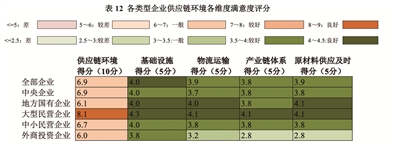 整体而言,各类企业对于供应链环境的总体评价一般,平均评分为6.9分,但是大型民营企业对于供应链环境的评价良好,给出了最高分8.1分,与之相比,外商投资企业的满意度得分最低(6.0分)(见表12)。