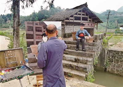 5月6日,采风的最后一天,韩玉臣以贵州喀斯特地貌和广袤的稻田为背景,刻画了一位勤劳质朴善良的水族妇女形象,整个画面达到了人景交融,栩栩如生的效果。